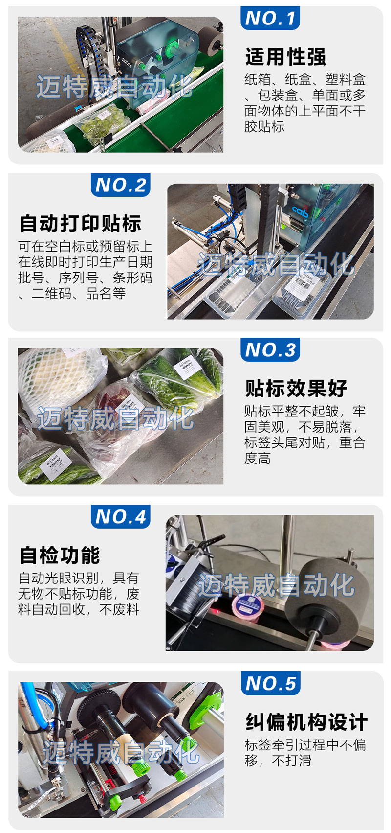 该设备适用于瓶子、盒子、成型包、包装箱等上平面的打印和贴标。可在空白标或预留标上在线即时打印生产日期批号、序列号、条形码、二维码、品名、专销区等预设内容并完成同步贴标。