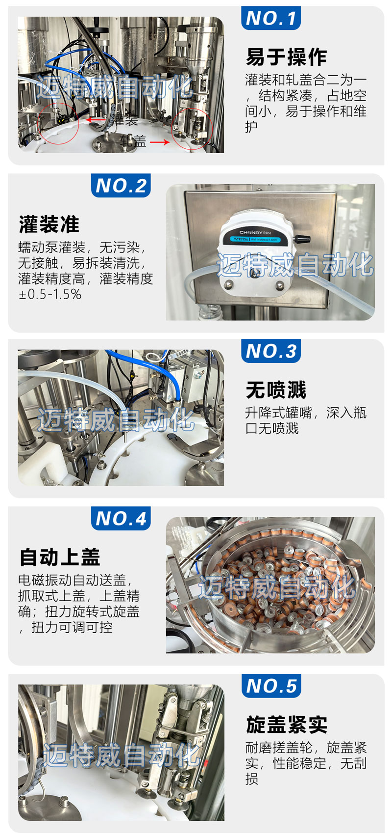 ● 电磁振动自动送盖,三刀离心式轧盖和扭力旋盖,具有无瓶不灌装的功能;