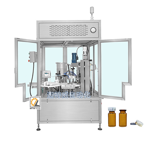 西林瓶灌装机适用于0.5-10、2-20、50-50、10-100ml的西林瓶、模制瓶的自动理瓶、灌装、加塞打塞、上盖锁盖等,可以配上贴标机同步完成瓶身的自动贴标。